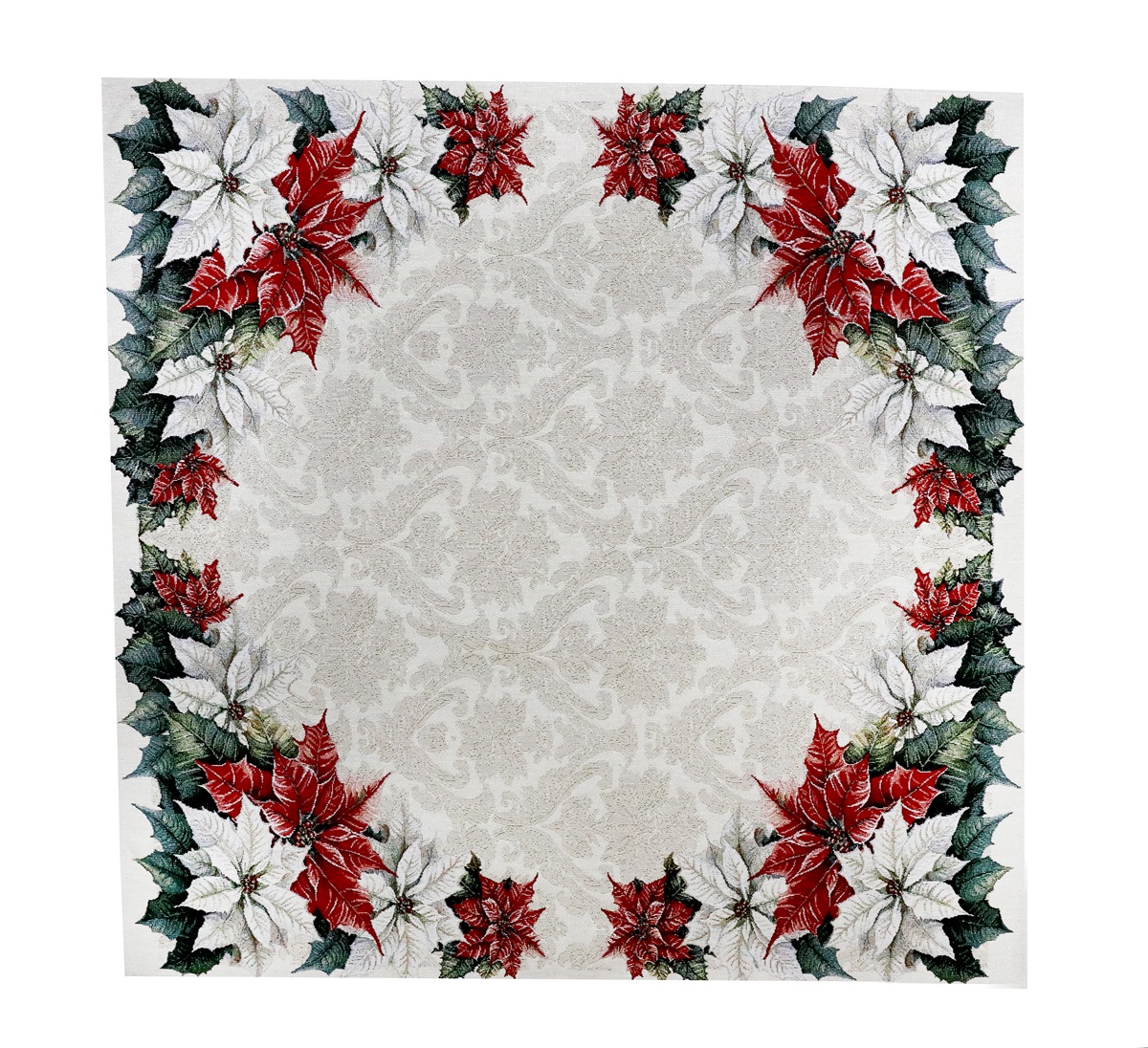Elegantný vianočný gobelínový obrus na stôl s bohatým vzorom vianočnej girlandy a jemným lurexovým leskom. Dokonalý doplnok na ozdobenie vášho domova počas sviatočného obdobia, ktorý prinesie tradičnú atmosféru a luxusný vzhľad do každej miestnosti.