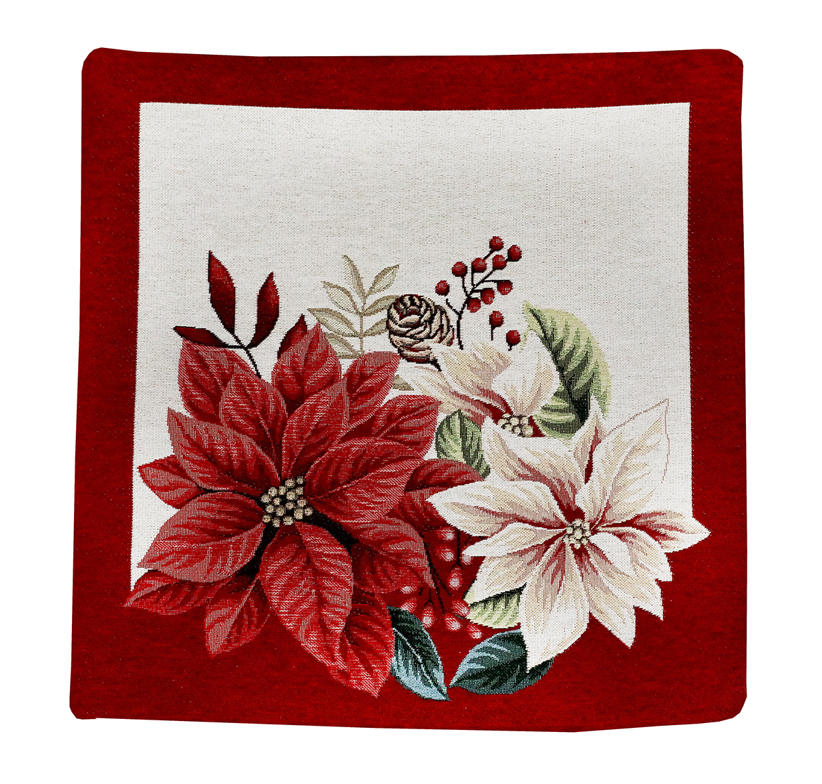 Dolaďte svoju sviatočnú výzdobu štýlovou gobelínovou obliečkou na vankúš s lurexom s nádherným motívom vianočných hviezd (poinsettií). Kombinácia bohatej červenej a elegantnej bielej kvetiny, doplnenej o zelené listy, šišku a červené bobuľky, vytvára tradičný a zároveň luxusný vzhľad. Červený rámik okolo vzoru dodáva obliečke ešte výraznejší slávnostný efekt.