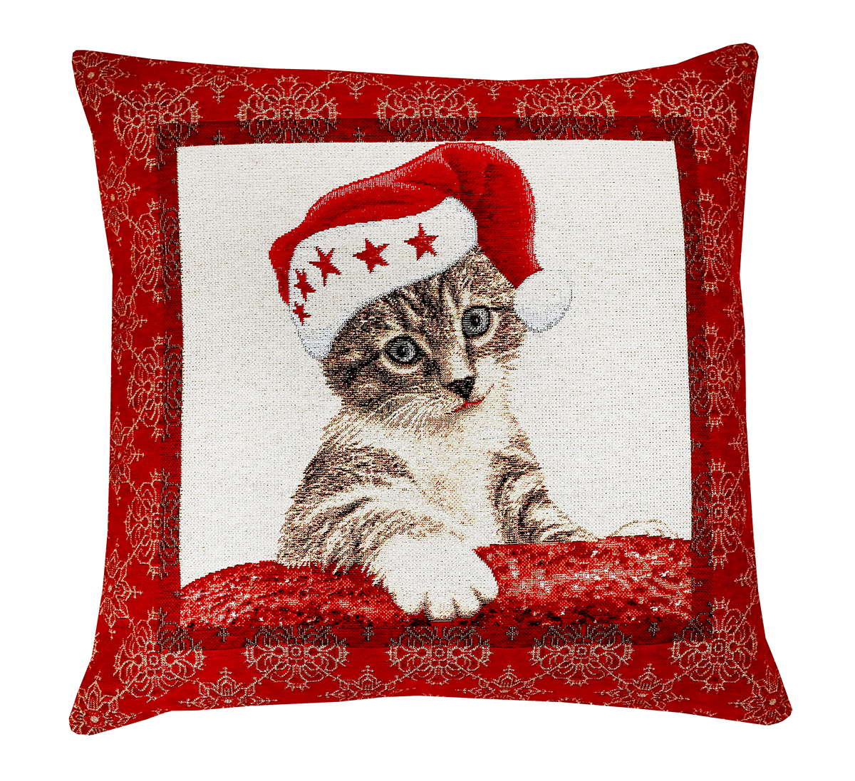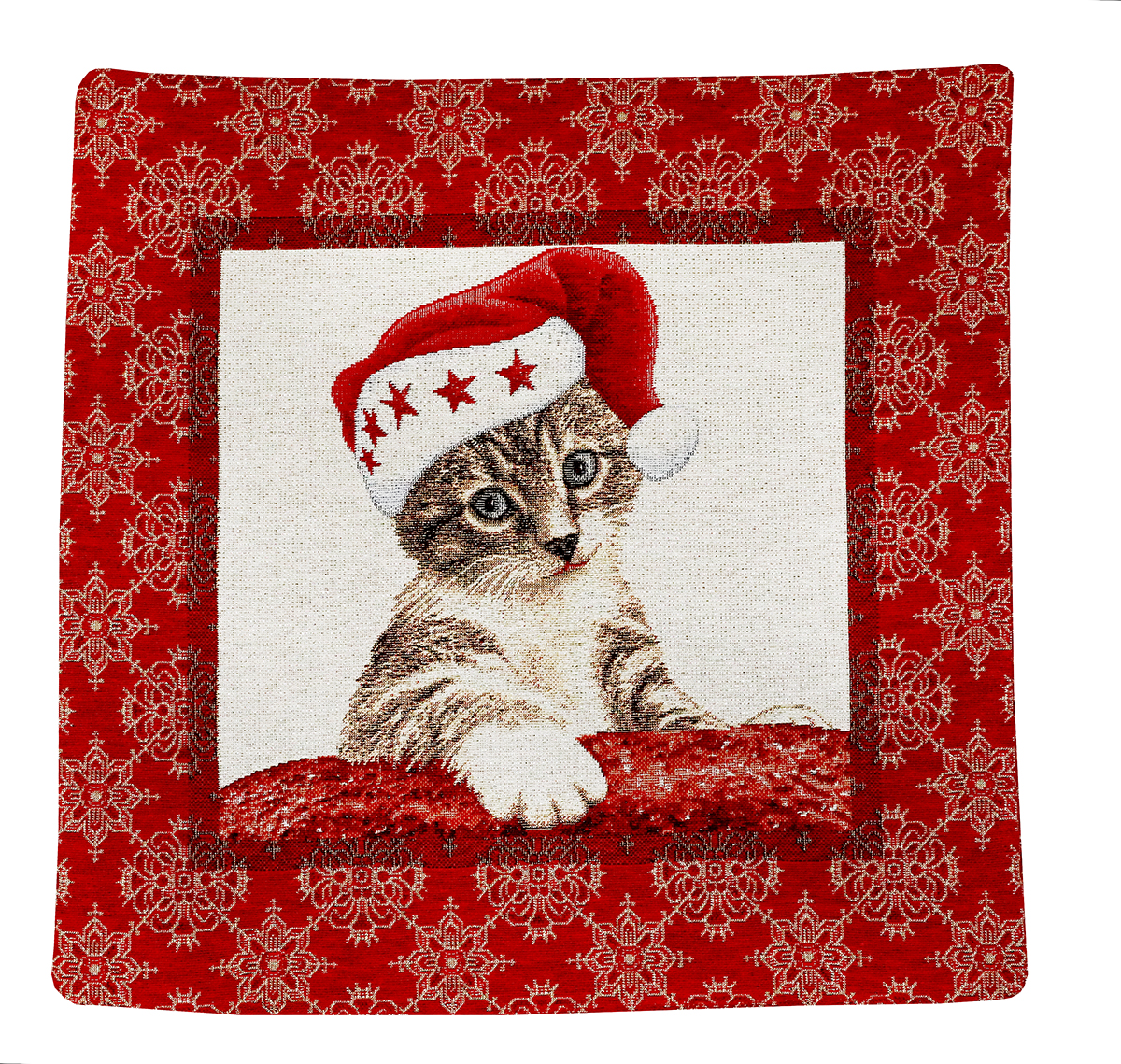 Vianočná gobelínová obliečka na vankúš s lurexom – mačička v Mikulášskej čiapke