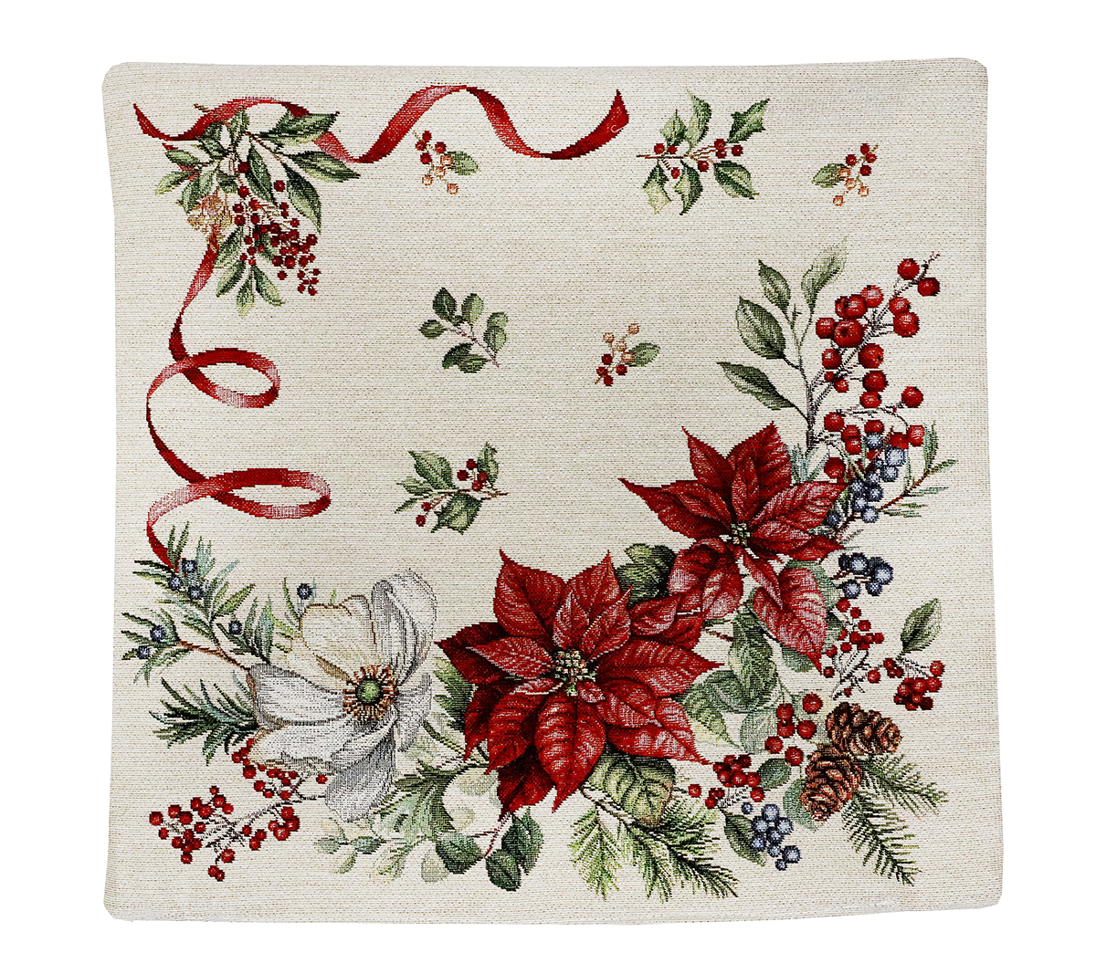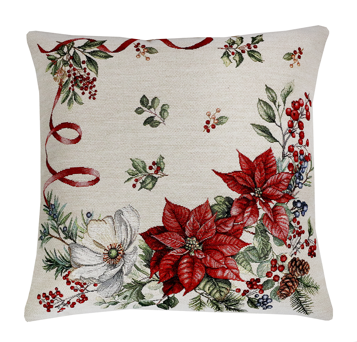 Elegantná gobelínová obliečka na vankúš s jemným leskom lurexu prinesie do vášho interiéru sviatočnú atmosféru. Je zdobená nádherným motívom červenej vianočnej hviezdy (poinsettie), bielych kvetov, cezmíny, ihličia a bobúľ, doplneným o červenú dekoratívnu stužku.