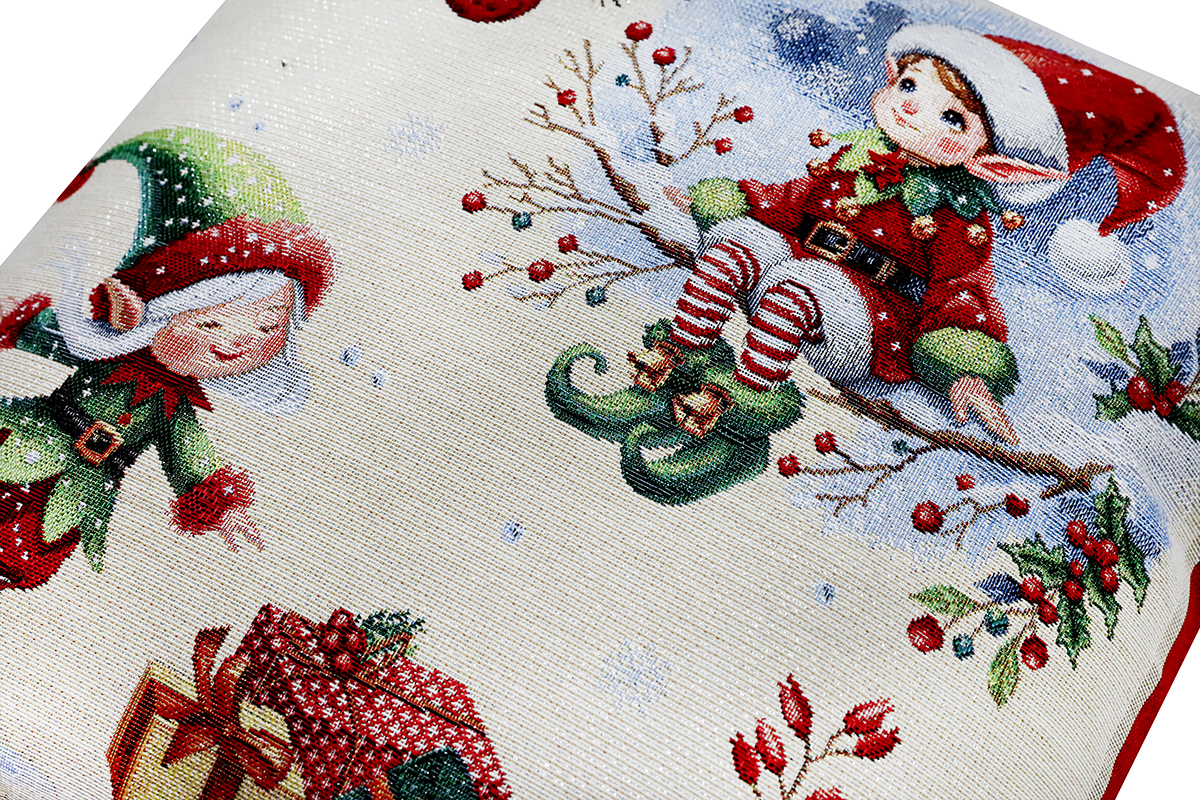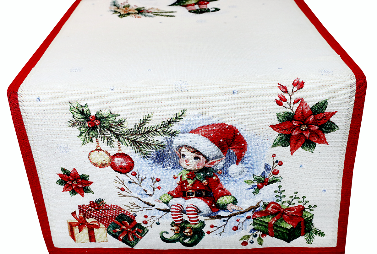 Tento krásny vianočný gobelínový behúň na stôl s motívom veselých škriatkov je dokonalým doplnkom pre váš domov počas sviatočného obdobia. Precízne vyhotovený s detailmi tradičnej vianočnej výzdoby, je pretkávaný jemným lurexom, čo dodáva behúňu na stôl elegantný trblietavý efekt. Veselí škriatkovia, darčeky a vianočné ozdoby vytvárajú rozprávkovú atmosféru.
